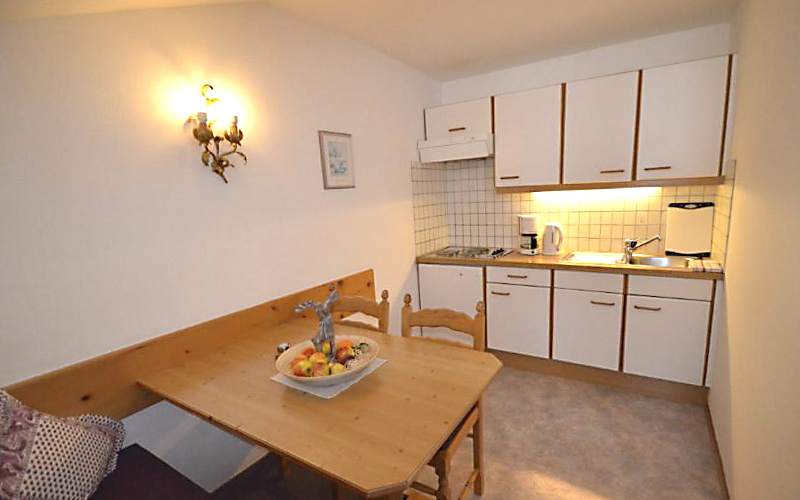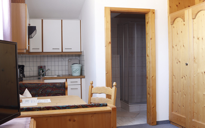 The apartment has a comfortable double bed (with optional extra bed) and a bright living area with satellite TV – perfect for relaxing evenings after an active day in nature. The well-equipped kitchenette with stove, refrigerator, coffee machine and kettle invites you to enjoy cooking together. The bathroom with shower and toilet offers the necessary comfort after a hike or ski tour.