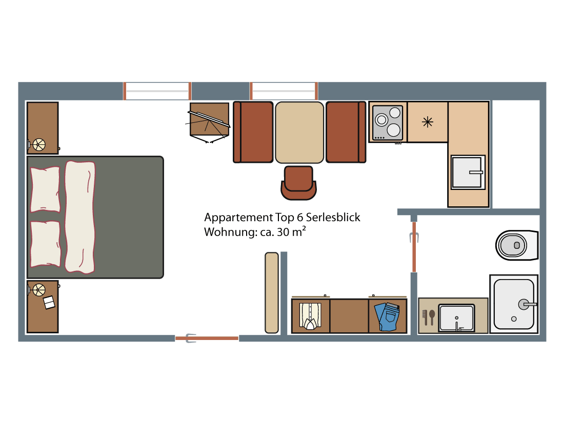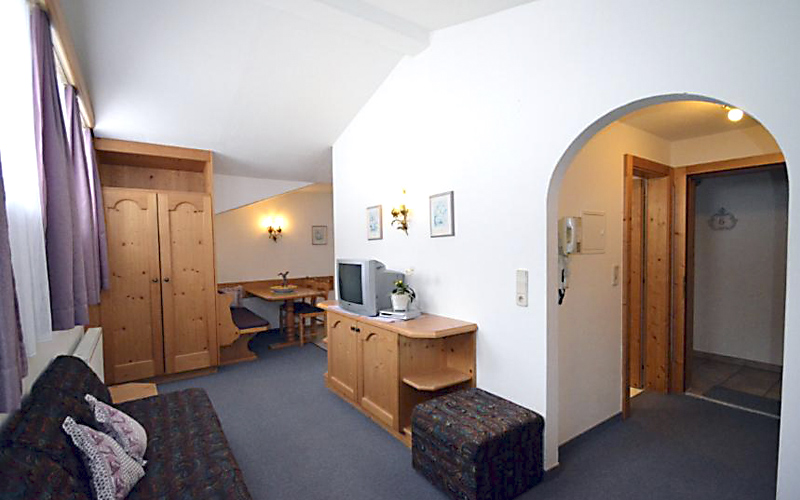 Our Serles apartment offers everything you need for a relaxing stay in a rustic, cosy Tyrolean style on approx. 30 m². The wooden furnishings create a warm, inviting atmosphere that will captivate you from the moment you arrive. Ideal for 1–2 people, the apartment offers a comfortable double bed, a practical kitchenette with stove, refrigerator, coffee machine, kettle and crockery, and a modern bathroom with shower/WC.